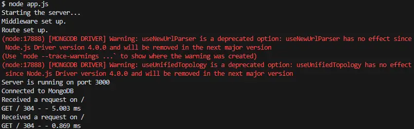 Now, you can run your node app.js file again in your terminal. You’ll see the message “Connected to MongoDB”
