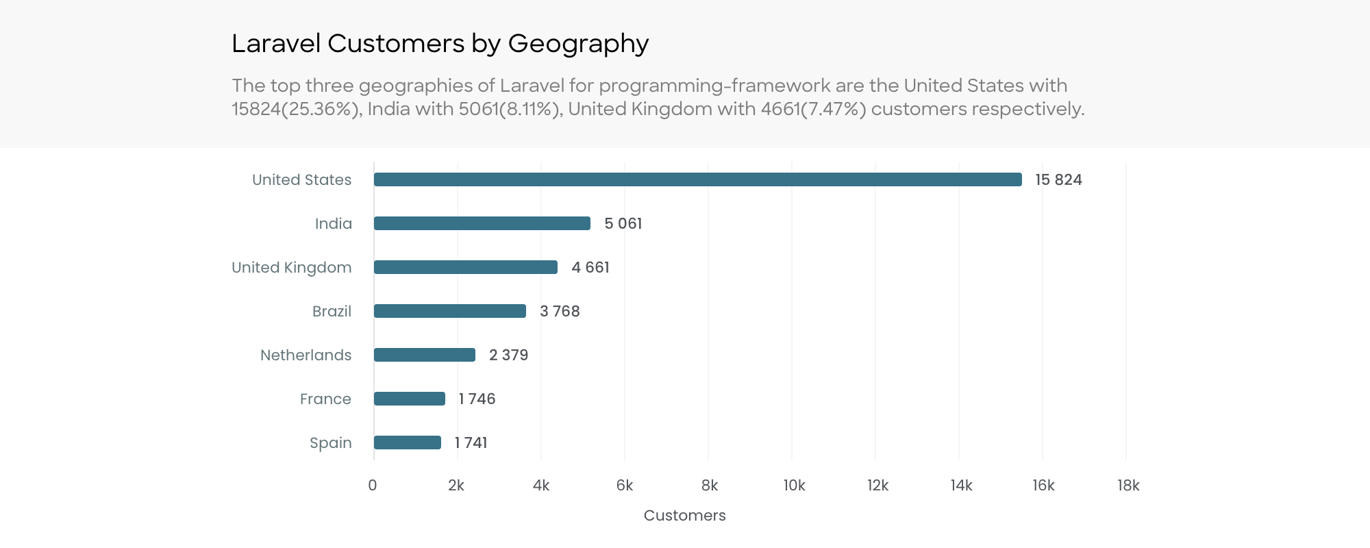 USA is the biggest user of Laravel Development services with 21.98% of all customers, followed by India and the United Kingdom with 8.75% and 7.77% customers respectively.